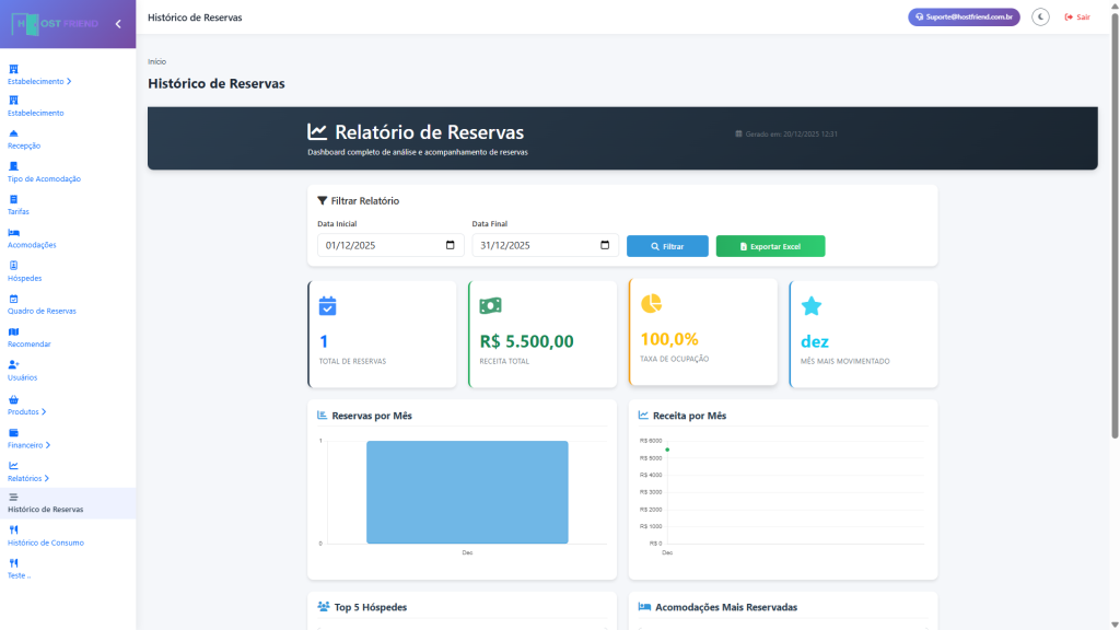 organizada e profissional, centralizando reservas, hóspedes e finanças em um único lugar.